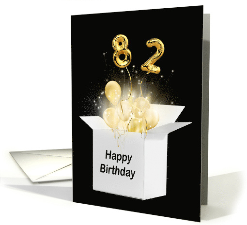 White box isolated on a black background filled with gold balloons, foil ribbons, and sparkles for 82nd birthday. This card does not print in gold ink.