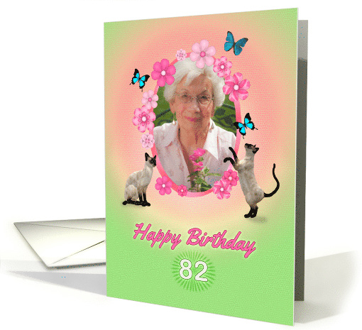 | Artist Notes: | A pair of playful siamese cats chasing butterflies. A photo of the birthday person is framed in flowers. Add a picture and a name to create a really cute 82nd birthday card. |