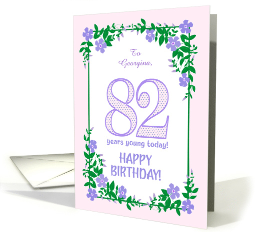 .A pretty 82nd birthday card that you can personalise on the front cover as well as inside. There is a border of blue and mauve periwinkles with glossy dark green leaves and very pale pink outside the border. The space for you to add the name or relationship of the recipient is at the top, above the number 82, which is large, outlined in periwinkle blue with matching polka dots on a pale pink background. Below the number, also in periwinkle blue is 'years young today!'. At the very bottom, are the words, 'HAPPY BIRTHDAY!', also in blue/mauve capital letters. The inside message is just a suggestion and you can easily change it or delete it if you prefer a 'blank inside' card.