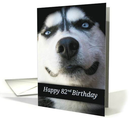 Give this fun Happy 82nd Birthday card with a smiling Siberian Husky! A cute blue eyed husky dog is a great way to send birthday wishes to that special 82 year old in your life!