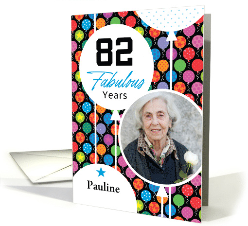 Tiny polka dot colorful balloons fill the background behind four larger balloons. One large balloon is customized with 82 fabulous years, another can have a personalized photo and the bottom one can have a custom name under the blue star. İMindy Pierce