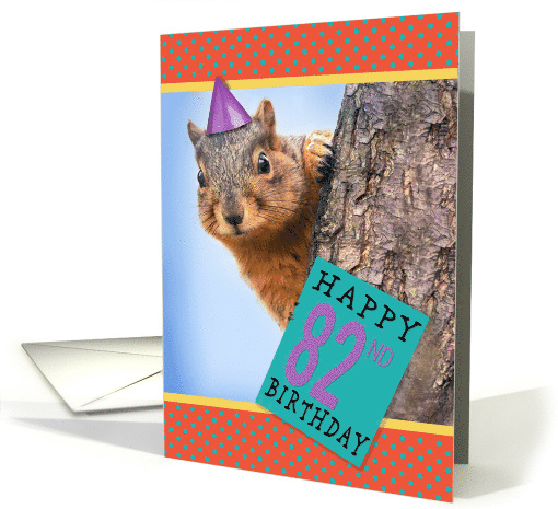 Ready to celebrate an 82nd birthday, this cute squirrel in a party hat up a tree is a cute way to say Happy Birthday!