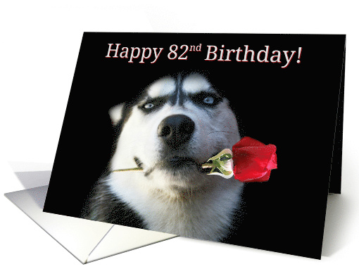 Know someone turning 82? Send a happy birthday to the next 82 year old with this fun and happy husky holding a rose. Sure to bring a smile!