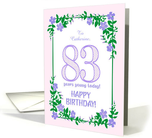 .A pretty 83rd birthday card that you can personalise on the front cover as well as inside. There is a border of blue and mauve periwinkles with glossy dark green leaves and very pale pink outside the border. The space for you to add the name or relationship of the recipient is at the top, above the number 83, which is large, outlined in periwinkle blue with matching polka dots on a pale pink background. Below the number, also in periwinkle blue is 'years young today!'. At the very bottom, are the words, 'HAPPY BIRTHDAY!', also in blue/mauve capital letters. The inside message is just a suggestion and you can easily change it or delete it if you prefer a 'blank inside' card.