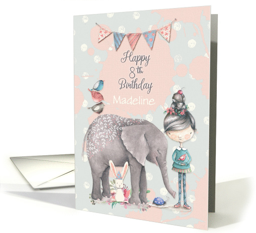 | Artist Notes: | Send Happy 8th Birthday with this adorable design that features a pretty girl surrounded by all of her animal friends. Animals include an elephant with vines on it's back, a white rabbit, 4 birds, and a blue ladybug. All elements are on a background of pale gray with cream colored circles and big pink splatters with a pretty patterned hanging banner and a little bouquet of flowers. You personalize the front with the recipient's name. |