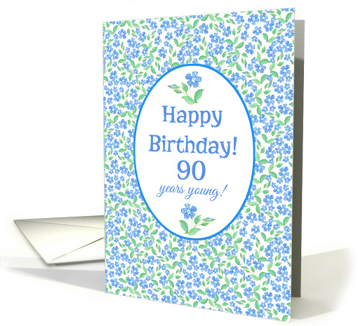 A very pretty 90th Birthday Card to personalize, with a country-style ditsy pattern of Bright Blue Periwinkle flowers on a white background. There is a white oval shape in the centre, edged with blue and the greeting, 'Happy Birthday! 90 years young!' is in blue lettering on the white background, together with a single periwinkle flower motif above and below the greeting. The inside message is just a suggestion so please feel free to change it or delete it altogether if you prefer.