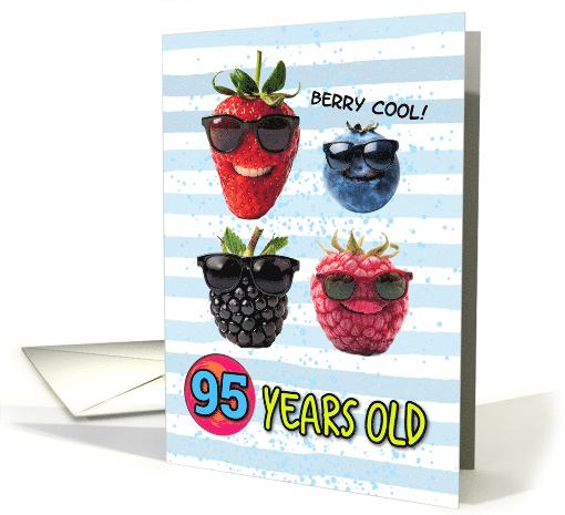 4 cool berries (strawberry, blueberry, blackberry and raspberrie) wearing sunglasses on a watercolor blue and white striped background with a splatter effect and the text "berry cool! 95 years old" in lime-green. A fun design for that special 95-year old celebrating their birthday.