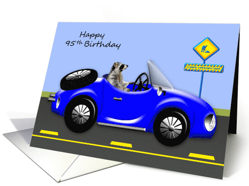 95th Birthday, age humor, adorable raccoon driving blue classic car