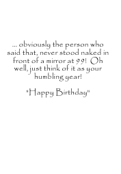 Wish anyone a Happy 99th Birthday with an age humor card featuring calk text with calk colored balloons on a chalkboard background. Inside, like all cards on Greeting Card Universe can be personalized by you if you wish. Obviously the person who said that, never stood naked in front of a mirror at 99! Oh well, just think of it as your humbling year! Happy Birthday