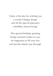 | Inside: | Today is the day for wishing you a world of happy things, and all the special pleasures a birthday always brings. This special birthday greeting brings warmest wishes to you, for happiness to fill your day and last the whole year through. |