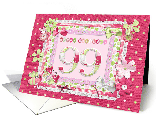 | Artist Notes: | 99th birthday card. Ribbons,bows and flowers. A birthday card for a patchworking queen! Laywers of bright colored cloth trimmed with ribbons. Cloth flowers and butterflies decorate this lovely card. Please note that the card is printed. |