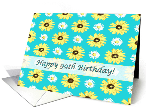 | Artist Notes: | This ninety ninth birthday card has yellow and white daisies on a turquoise background, a white horizontal semitransparent stripe with a yellow thin line border accent, and the phrase: "Happy 99th Birthday!" |