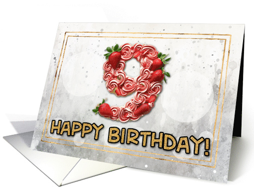 A delicious birthday strawberry cream cake in the shape of a number 9 on a grey watercolor grunge splatter background with a gold colored trim and the text "Happy Birthday!" in a gold colored glitter effect. A perfect card to send to that wonderful 9-year old for their birthday.