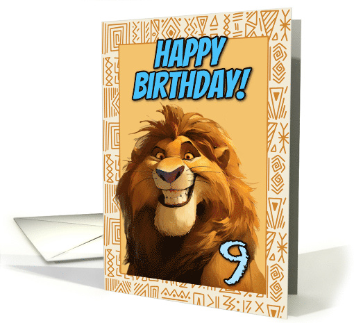 This birthday card features a cartoon-style lion with a big, toothy grin. The lion has a fluffy mane and an expressive face that conveys excitement and happiness. The background of the card is a warm yellow color, and it's framed by a border of various geometric patterns and shapes in a light brown or orange color. These patterns give the card an African or tribal-inspired aesthetic, which complements the lion theme. The text "HAPPY BIRTHDAY!" is prominently displayed at the top in large, blue letters with a black outline, giving it a bold, energetic look.