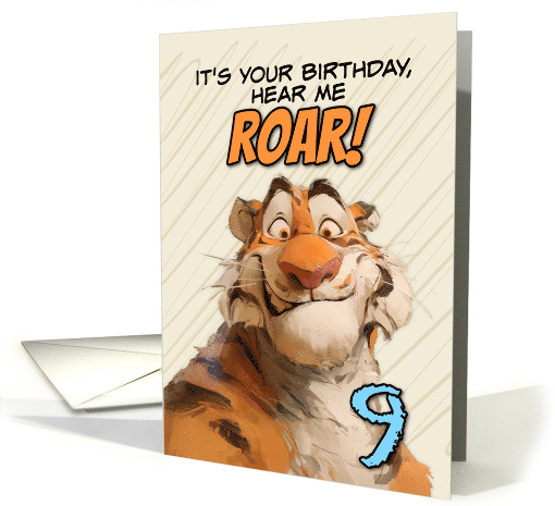 This birthday card features a cartoon-style tiger character. The tiger's face dominates the frame, wearing a friendly, slightly mischievous expression with raised eyebrows and a subtle smile. The character's distinctive features include large, expressive yellow eyes with small pupils, a broad orange nose, and visible whiskers. The illustration style is painterly and loose, with visible brushstrokes giving texture to the tiger's fur. The coloring is warm, with shades of orange, white, and brown creating the tiger's coat pattern. The background is a light cream color with faint diagonal lines running across it, which adds depth and a sense of movement to the image. At the top is the text "it's your birthday, hear me ROAR!"