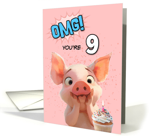 Artist Notes: This birthday card features a playful and vibrant animal design. The main elements include a large "OMG!" exclamation in blue text at the top.Then the age written in black and white text. A cartoon-style pig character with a surprised and excited expression, holding its face with its hands (or hooves). A cupcake with white frosting, colorful sprinkles, and a single lit candle in the bottom right corner. A pink background with lighter pink starburst and dot patterns. The overall aesthetic is fun, youthful, and slightly quirky, perfect for a lighthearted birthday celebration.
