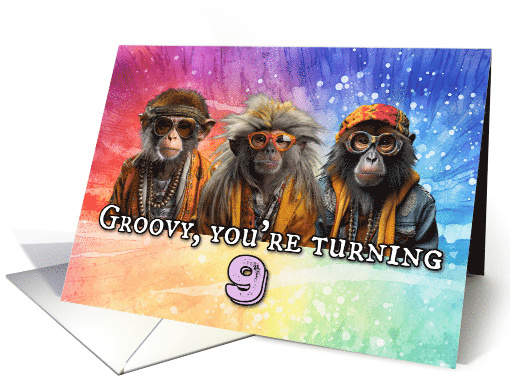 Three monkey hippies on a rainbow colored tie-dye inspired watercolor background are picking up on the birthday vibes, with the text "Groovy, you're turning 9". Fun card to send to that special birthday boy or girl turning nine. Stay wild, moon child!