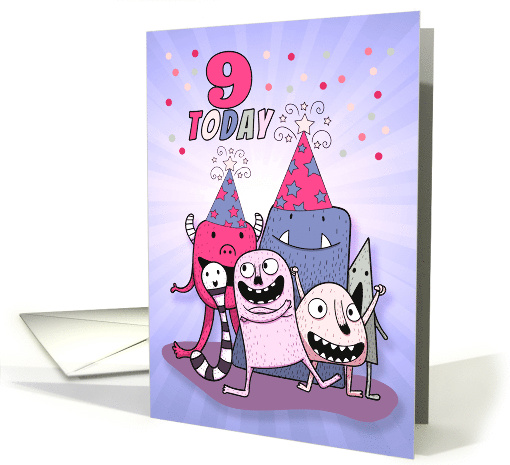 In fun comic book or cartoon style, this pink and purple group of birthday monsters wish the nine-year-old a BIG birthday celebration!