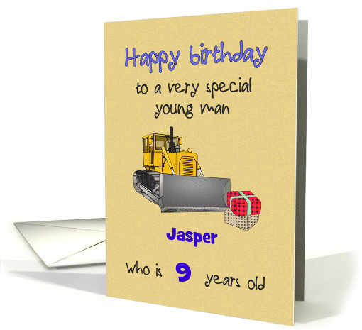 A birthday greeting for a young boy featuring a bulldozer and presents. This design is customizable for the name and age.