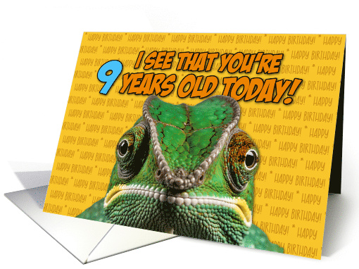'I see That You're Nine Years Old Today!' A close-up shot of a googly-eyed chameleon looking straight at the birthday boy or girl on a yellow background with the repeating words 'Happy Birthday!' A fun way of wishing someone a Happy Birthday.