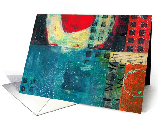 This card is based on an original abstract painting in acrylic, also utilizing collage techniques. It is titled ' Vibrant '. The colors of the setting sun bring the city landscape alive with color. Inside text: Many happy returns of the day!