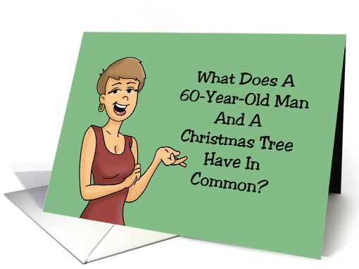 | Artist Notes: | Humorous Adult Birthday card for a man turning sixty, with a cartoon woman on a green background. The words say: What does a 60-year-old man and a Christmas tree have in common? Inside says: The wood is dead and the balls are just for decoration! Happy Birthday |
