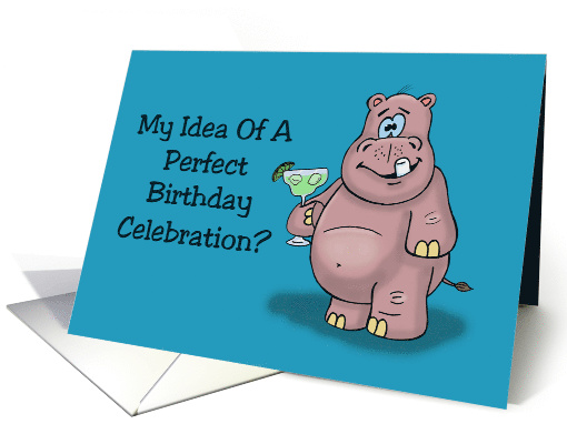 Humorous Adult Birthday card with a cartoon hippo holding a margarita glass. The words say, My idea of a perfect Birthday celebration? You, me, and two pitchers of margaritas! Happy Birthday