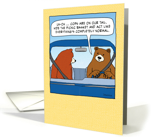 This funny birthday card features two bears on the run after stealing a picnic birthday. With the police on their tails, their plan is to act as if everything is completely normal. ©2015 Chuck Ingwersen