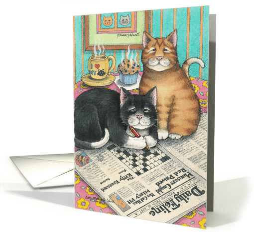 | Artist Notes: | Whimsical orange tabby & tuxedo cat sitting on a newspaper doing the daily kitty crossword puzzle. Hot beverage and muffin in background. Rhyming happy birthday verse inside. Verse can easily be personalized. For the Crossword puzzle fan & cat lover. |