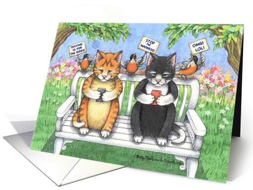 | Artist Notes: | Cats Bud and Tony seated on a park bench feverishly texting while birds perched behind them protest with signage saying: "TEXTING IS FOR THE BIRDS!", "STOP THE MADNESS!" & "OMG! LOL!" Great birthday wish for Cat lovers who are obsessed with their cell phones. |