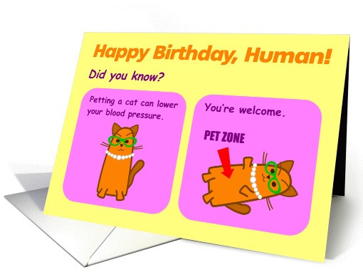 Card from the "Happy Birthday, Human!" series featuring Triviacats cat cartoon characters. Colorful cartoon image of a cute, fancy cat wearing glasses sharing the fact that petting a cat can lower a person's blood pressure in a humorous way. Card features bold images and text in a pleasant combination of yellow, orange, and purple. Cat fans will love getting a birthday card from a cat's perspective.