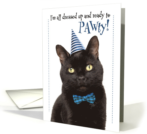 Artist Notes: | Send this sweet face of a black kitty ready to PAWty in his tiny party hat and blue bow tie to wish anyone a Happy Birthday! |