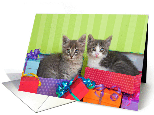 | Artist Notes: | Two one month old tabby kittens one in birthday present one walking by piles of brightly colored boxes bright green stripped background, Happy Birthday kittens |