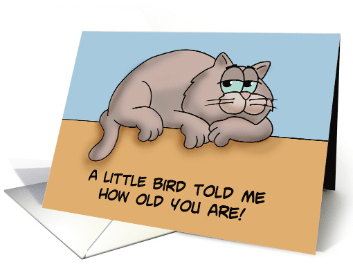 Humorous Birthday Card with a cartoon cat. The words say: A little bird told me how old you are! Inside says: So I ate him! Happy Birthday