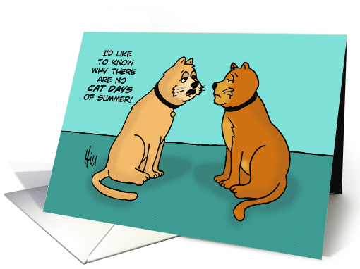 Humorous Birthday card with a cartoon showing two cats. One says: I'd like to know why there are no cat days of summer! Inside says: Happy Birthday
