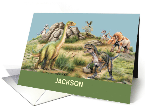 Capture the charm of birthdays with this delightful customizable card! The front showcases a vibrant scene of baby dinosaurs, setting the stage for a joyous prehistoric celebration. Amidst the playful illustration, personalize it with the recipient's name. Inside, warm wishes unfold, expressing the hope that their day is as amazing as they are, filled with love and roaring fun. Versatile and visually captivating, this card not only adds a personal touch but also brings a whimsical and heartfelt greeting to life. Share the joy on their special day with the dinosaur lover child in your life, with this charming and customizable life-like dino creation!