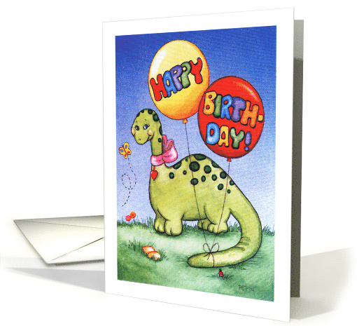 | Artist Notes: | Give this colorful birthday card to some child you love. The cover features my happy green dinosaur, balloons, flowers, rocks, butterfly, and a red lady bug. The image has a digital texture effect to give a 'canvas' look. You may change the inside message if you wish. ©Gail Pepin |
