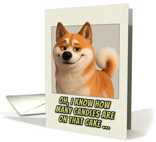 This birthday card features a realistic portrait of an adorable Akita dog. The dog has expressive brown eyes and a smirk on it's face.The portrait is set against a cream-colored background with subtle vertical pinstripes. Below the dog's image, green text with black outlines reads: "OH, I KNOW HOW MANY CANDLES ARE ON THAT CAKE..." This creates the same humorous birthday message about age awareness, but now from a dog's perspective. The card plays on the idea that pets are always watching and observing their owners, turning this into a playful joke about birthday candle counting and getting older. Perfect card for dog parents, dog lovers, people who appreciate gentle age humor, milestone birthdays, and people who enjoy cards with attitude and personality.