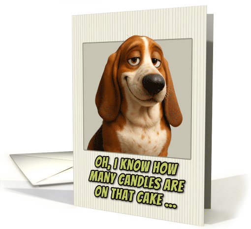 This birthday card features a realistic portrait of an adorable Basset Hound. The dog has expressive brown eyes and a smirk on it's face.The portrait is set against a cream-colored background with subtle vertical pinstripes. Below the dog's image, green text with black outlines reads: "OH, I KNOW HOW MANY CANDLES ARE ON THAT CAKE..." This creates the same humorous birthday message about age awareness, but now from a dog's perspective. The card plays on the idea that pets are always watching and observing their owners, turning this into a playful joke about birthday candle counting and getting older. Perfect card for dog parents, dog lovers, people who appreciate gentle age humor, milestone birthdays, and people who enjoy cards with attitude and personality.