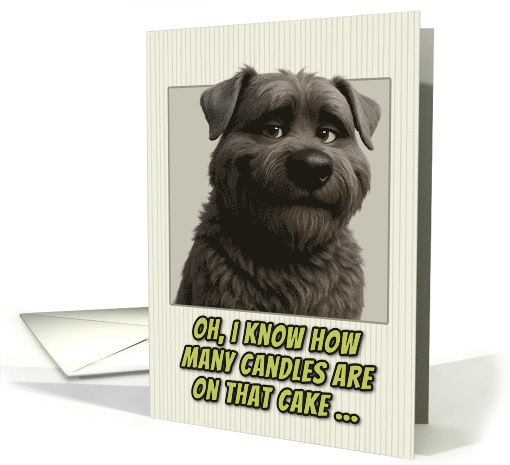 This birthday card features a realistic portrait of an adorable Bouvier des Flandres dog. The dog has expressive brown eyes and a smirk on it's face.The portrait is set against a cream-colored background with subtle vertical pinstripes. Below the dog's image, green text with black outlines reads: "OH, I KNOW HOW MANY CANDLES ARE ON THAT CAKE..." This creates the same humorous birthday message about age awareness, but now from a dog's perspective. The card plays on the idea that pets are always watching and observing their owners, turning this into a playful joke about birthday candle counting and getting older. Perfect card for dog parents, dog lovers, people who appreciate gentle age humor, milestone birthdays, and people who enjoy cards with attitude and personality.