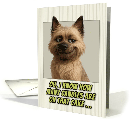 This birthday card features a realistic portrait of an adorable Cairn Terrier dog. The dog has expressive brown eyes and a smirk on it's face.The portrait is set against a cream-colored background with subtle vertical pinstripes. Below the dog's image, green text with black outlines reads: "OH, I KNOW HOW MANY CANDLES ARE ON THAT CAKE..." This creates the same humorous birthday message about age awareness, but now from a dog's perspective. The card plays on the idea that pets are always watching and observing their owners, turning this into a playful joke about birthday candle counting and getting older. Perfect card for dog parents, dog lovers, people who appreciate gentle age humor, milestone birthdays, and people who enjoy cards with attitude and personality.