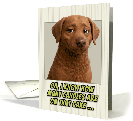 This birthday card features a realistic portrait of an adorable Chesapeake Bay Retriever dog. The dog has expressive brown eyes and a smirk on it's face.The portrait is set against a cream-colored background with subtle vertical pinstripes. Below the dog's image, green text with black outlines reads: "OH, I KNOW HOW MANY CANDLES ARE ON THAT CAKE..." This creates the same humorous birthday message about age awareness, but now from a dog's perspective. The card plays on the idea that pets are always watching and observing their owners, turning this into a playful joke about birthday candle counting and getting older. Perfect card for dog parents, dog lovers, people who appreciate gentle age humor, milestone birthdays, and people who enjoy cards with attitude and personality.
