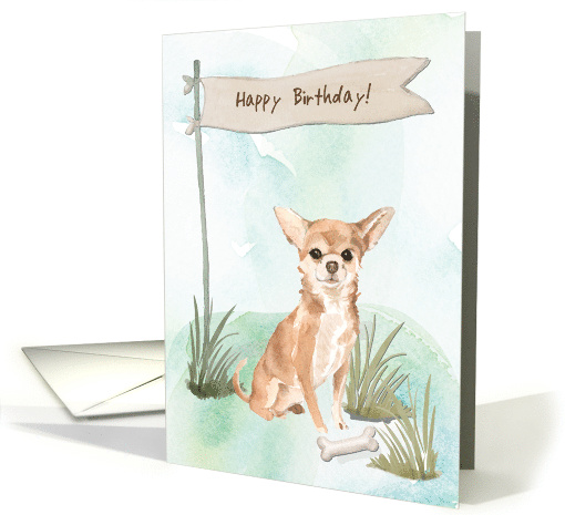 | Artist Notes: | Small but full of personality, this Chihuahua birthday card is perfect for those who love this spunky little breed! The watercolor outdoor setting of grass and sky complements the pup’s big attitude, while a rustic flag-style banner adds a festive touch. A great way to send birthday cheer with a tiny dog that has a huge heart! |