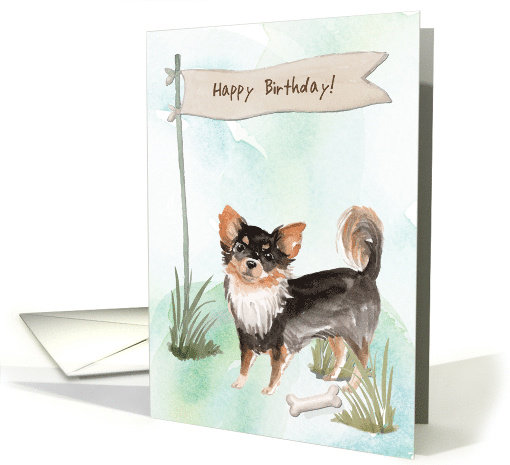 | Artist Notes: | This Long-Haired Chihuahua birthday card is as fluffy as it is full of personality! With its expressive eyes and luxurious coat, the pup sits in a watercolor outdoor scene, while a rustic flag-style banner adds a festive touch. A wonderful way to celebrate a special day for Chihuahua enthusiasts. |