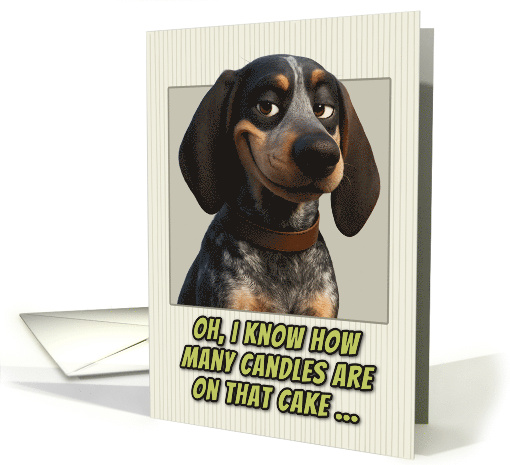 | Artist Notes: | This birthday card features a realistic portrait of an adorable Bluetick Coonhound dog. The dog has expressive brown eyes and a smirk on it's face.The portrait is set against a cream-colored background with subtle vertical pinstripes. Below the dog's image, green text with black outlines reads: "OH, I KNOW HOW MANY CANDLES ARE ON THAT CAKE..." This creates the same humorous birthday message about age awareness, but now from a dog's perspective. The card plays on the idea that pets are always watching and observing their owners, turning this into a playful joke about birthday candle counting and getting older. Perfect card for dog parents, dog lovers, people who appreciate gentle age humor, milestone birthdays, and people who enjoy cards with attitude and personality. |