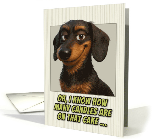 This birthday card features a realistic portrait of an adorable wire-haired Dachshund dog. The dog has expressive brown eyes and a smirk on it's face.The portrait is set against a cream-colored background with subtle vertical pinstripes. Below the dog's image, green text with black outlines reads: "OH, I KNOW HOW MANY CANDLES ARE ON THAT CAKE..." This creates the same humorous birthday message about age awareness, but now from a dog's perspective. The card plays on the idea that pets are always watching and observing their owners, turning this into a playful joke about birthday candle counting and getting older. Perfect card for dog parents, dog lovers, people who appreciate gentle age humor, milestone birthdays, and people who enjoy cards with attitude and personality.