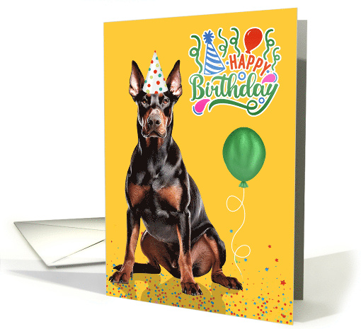 | Title: | Birthday Doberman Pinscher Dog in a Party Hat on Yellow |