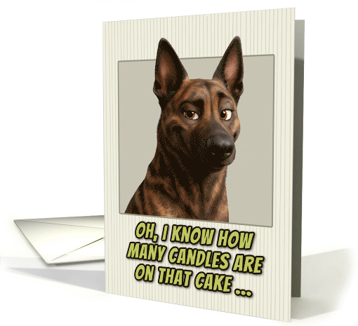 This birthday card features a realistic portrait of an adorable Dutch Shepherd dog. The dog has expressive brown eyes and a smirk on it's face.The portrait is set against a cream-colored background with subtle vertical pinstripes. Below the dog's image, green text with black outlines reads: "OH, I KNOW HOW MANY CANDLES ARE ON THAT CAKE..." This creates the same humorous birthday message about age awareness, but now from a dog's perspective. The card plays on the idea that pets are always watching and observing their owners, turning this into a playful joke about birthday candle counting and getting older. Perfect card for dog parents, dog lovers, people who appreciate gentle age humor, milestone birthdays, and people who enjoy cards with attitude and personality.