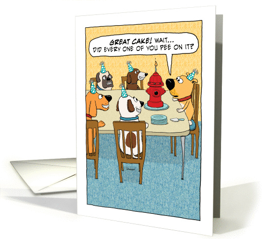 This funny birthday card features a dog who loves the fire hydrant cake but realizes that all the party guests probably peed on it. © Chuck Ingwersen