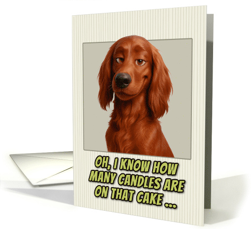 | Artist Notes: | This birthday card features a realistic portrait of an adorable Irish Setter dog. The dog has expressive brown eyes and a smirk on it's face.The portrait is set against a cream-colored background with subtle vertical pinstripes. Below the dog's image, green text with black outlines reads: "OH, I KNOW HOW MANY CANDLES ARE ON THAT CAKE..." This creates the same humorous birthday message about age awareness, but now from a dog's perspective. The card plays on the idea that pets are always watching and observing their owners, turning this into a playful joke about birthday candle counting and getting older. Perfect card for dog parents, dog lovers, people who appreciate gentle age humor, milestone birthdays, and people who enjoy cards with attitude and personality. |
